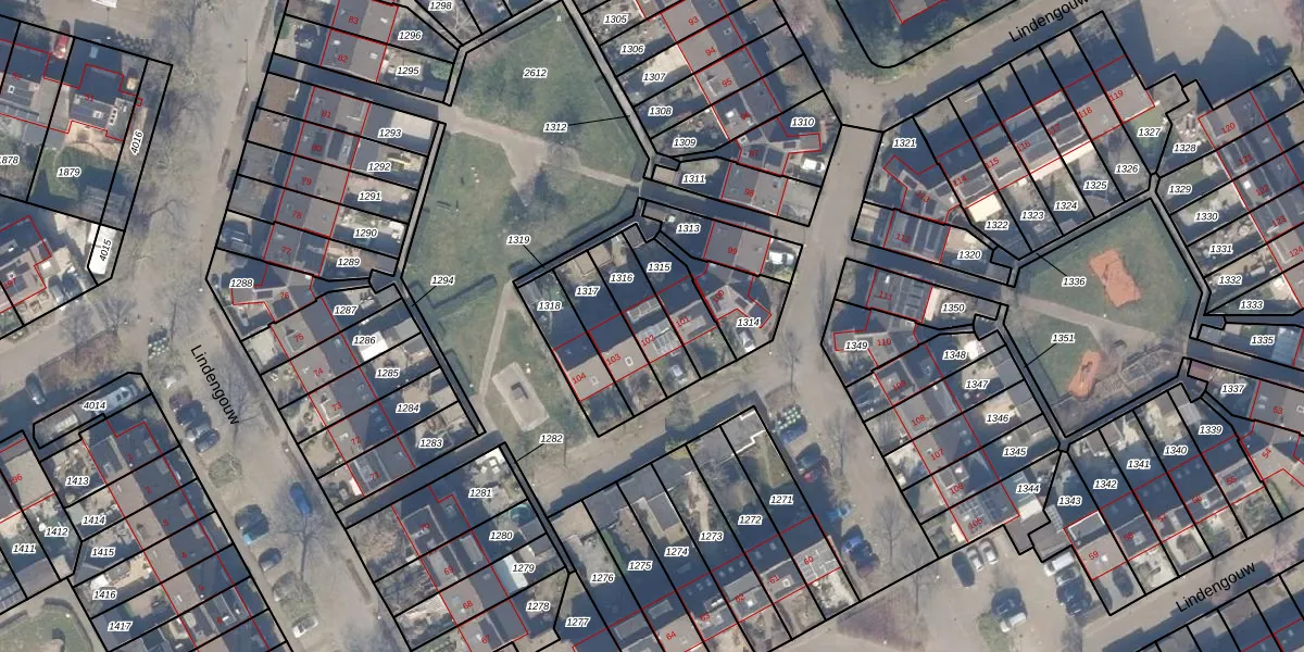 Lindengouw 102 is gelegen op kadastraal perceel AMR04G1316. Deze kadastrale aanduiding is uniek en wordt gebruikt door het Kadaster om eigendomsrechten en andere zakelijke rechten vast te leggen. Het perceel maakt onderdeel uit van de kadastrale gemeente Almere.