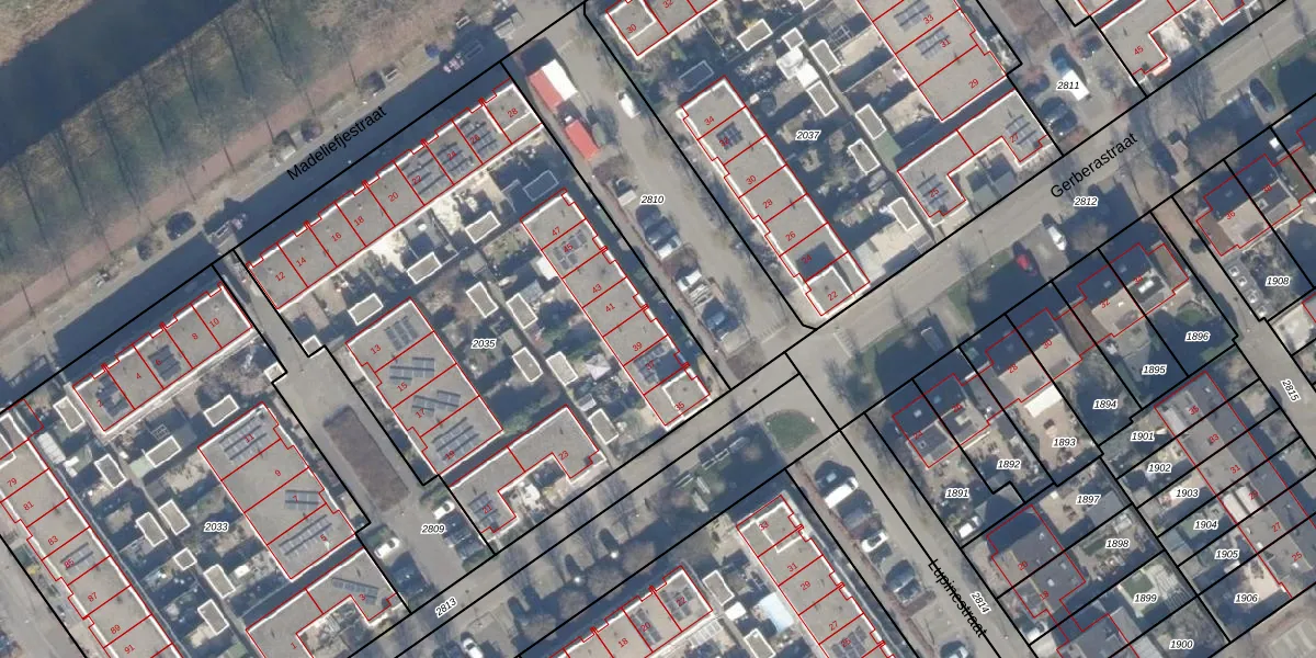 Het perceel waarop Lupinestraat 39 staat heeft een oppervlakte van 2860 m². Dit is een zeer groot perceel. De perceeloppervlakte wordt geregistreerd door het Kadaster. Gedetailleerde informatie over de maten van dit perceel kunt u vinden in het rapport Kadastrale kaart met maatvoering van Lupinestraat 39.