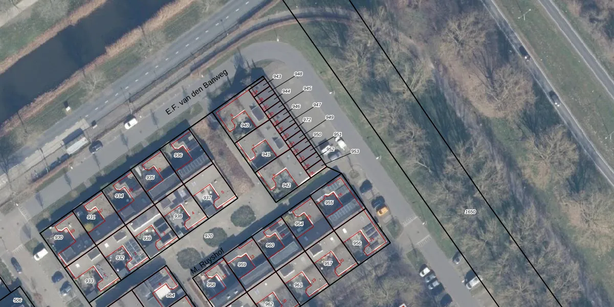 Het perceel waarop M. Ruyshof 22-J staat heeft een oppervlakte van 19 m². Dit is een klein perceel. De perceeloppervlakte wordt geregistreerd door het Kadaster. Gedetailleerde informatie over de maten van dit perceel kunt u vinden in het rapport Kadastrale kaart met maatvoering van M. Ruyshof 22-J.