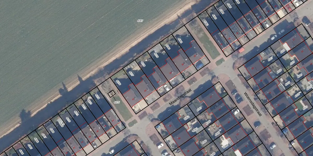 Maandagstraat 38 is gelegen op kadastraal perceel AMR04B4378. Deze kadastrale aanduiding is uniek en wordt gebruikt door het Kadaster om eigendomsrechten en andere zakelijke rechten vast te leggen. Het perceel maakt onderdeel uit van de kadastrale gemeente Almere.