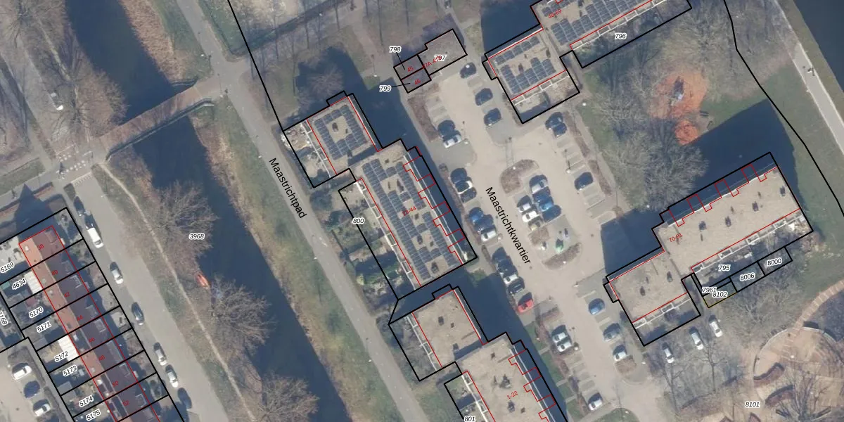 Het perceel waarop Maastrichtkwartier 30 staat heeft een oppervlakte van 971 m². Dit is een groot perceel. De perceeloppervlakte wordt geregistreerd door het Kadaster. Gedetailleerde informatie over de maten van dit perceel kunt u vinden in het rapport Kadastrale kaart met maatvoering van Maastrichtkwartier 30.