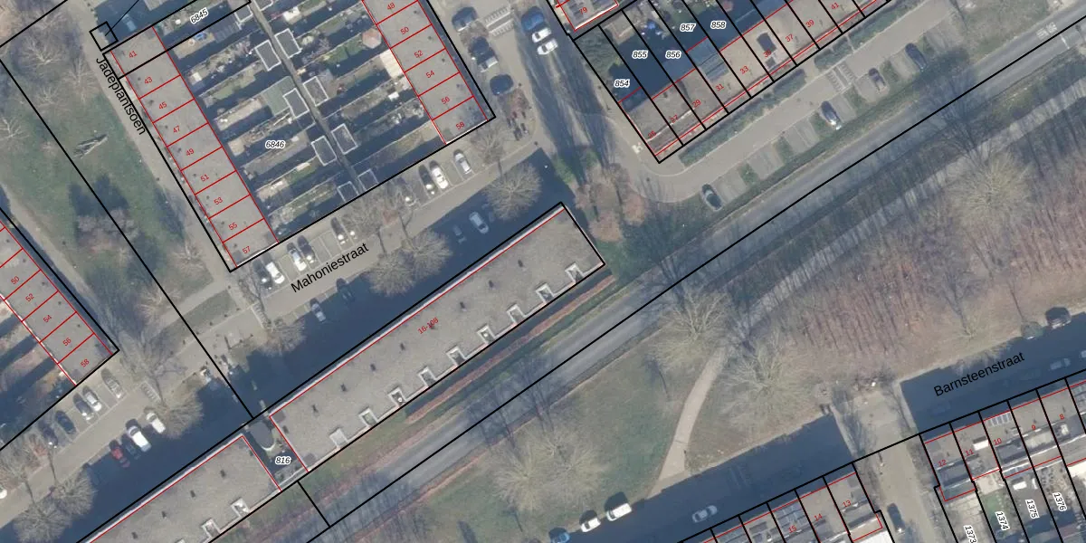 Het perceel waarop Mahoniestraat 106 staat heeft een oppervlakte van 1952 m². Dit is een zeer groot perceel. De perceeloppervlakte wordt geregistreerd door het Kadaster. Gedetailleerde informatie over de maten van dit perceel kunt u vinden in het rapport Kadastrale kaart met maatvoering van Mahoniestraat 106.