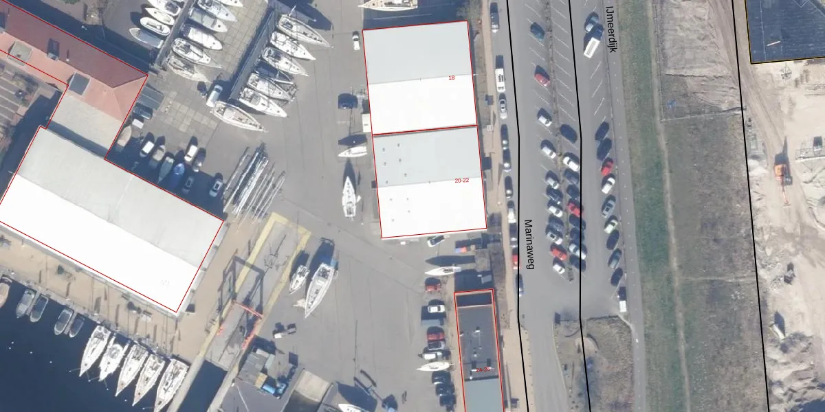 Het perceel waarop Marinaweg 20 staat heeft een oppervlakte van 16,1 ha. Dit is een zeer groot perceel. De perceeloppervlakte wordt geregistreerd door het Kadaster. Gedetailleerde informatie over de maten van dit perceel kunt u vinden in het rapport Kadastrale kaart met maatvoering van Marinaweg 20.