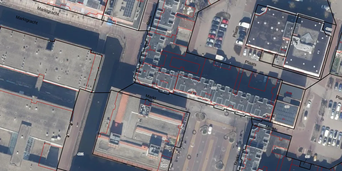 Het perceel waarop Markt 108 staat heeft een oppervlakte van 3440 m². Dit is een zeer groot perceel. De perceeloppervlakte wordt geregistreerd door het Kadaster. Gedetailleerde informatie over de maten van dit perceel kunt u vinden in het rapport Kadastrale kaart met maatvoering van Markt 108.