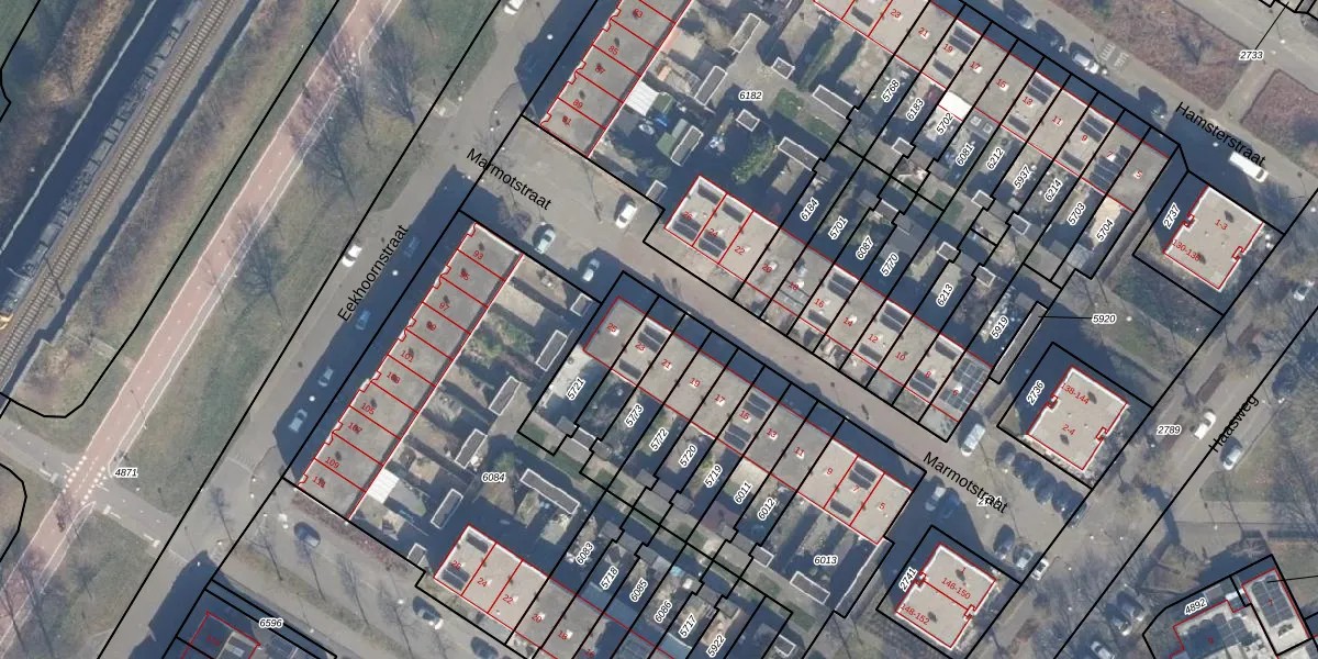 Het perceel waarop Marmotstraat 23 staat heeft een oppervlakte van 1857 m². Dit is een zeer groot perceel. De perceeloppervlakte wordt geregistreerd door het Kadaster. Gedetailleerde informatie over de maten van dit perceel kunt u vinden in het rapport Kadastrale kaart met maatvoering van Marmotstraat 23.