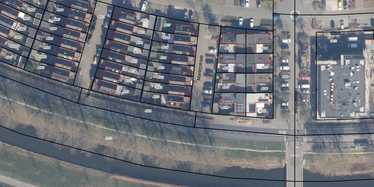Marterstraat 14 is gelegen op kadastraal perceel AMR04N4021. Deze kadastrale aanduiding is uniek en wordt gebruikt door het Kadaster om eigendomsrechten en andere zakelijke rechten vast te leggen. Het perceel maakt onderdeel uit van de kadastrale gemeente Almere.