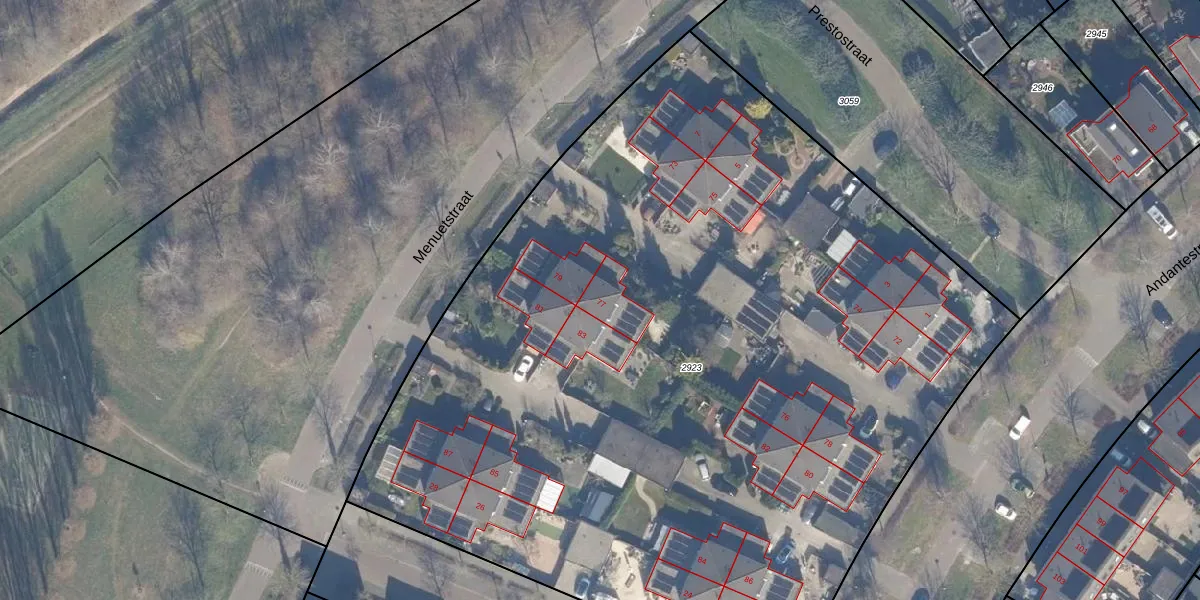 Het perceel waarop Menuetstraat 77 staat heeft een oppervlakte van 6655 m². Dit is een zeer groot perceel. De perceeloppervlakte wordt geregistreerd door het Kadaster. Gedetailleerde informatie over de maten van dit perceel kunt u vinden in het rapport Kadastrale kaart met maatvoering van Menuetstraat 77.