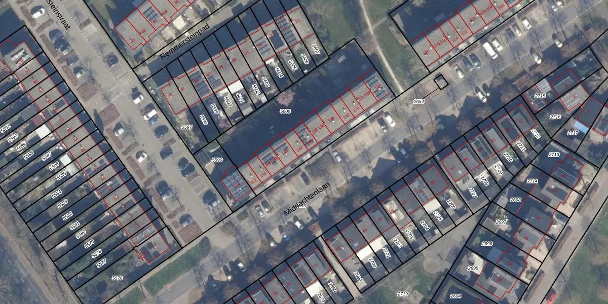 Middachtenlaan 142 is gelegen op kadastraal perceel AMR04N5608. Deze kadastrale aanduiding is uniek en wordt gebruikt door het Kadaster om eigendomsrechten en andere zakelijke rechten vast te leggen. Het perceel maakt onderdeel uit van de kadastrale gemeente Almere.