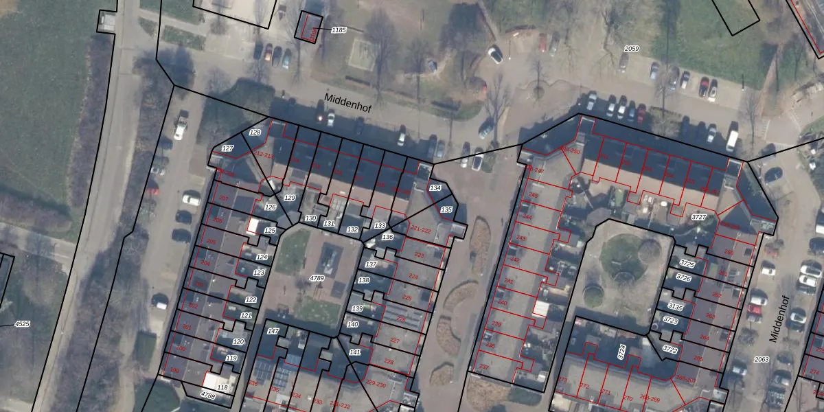Het perceel waarop Middenhof 219 staat heeft een oppervlakte van 133 m². Dit is een middelgroot perceel. De perceeloppervlakte wordt geregistreerd door het Kadaster. Gedetailleerde informatie over de maten van dit perceel kunt u vinden in het rapport Kadastrale kaart met maatvoering van Middenhof 219.