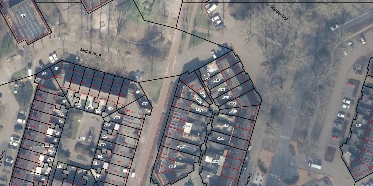Het perceel waarop Middenhof 321 staat heeft een oppervlakte van 106 m². Dit is een middelgroot perceel. De perceeloppervlakte wordt geregistreerd door het Kadaster. Gedetailleerde informatie over de maten van dit perceel kunt u vinden in het rapport Kadastrale kaart met maatvoering van Middenhof 321.