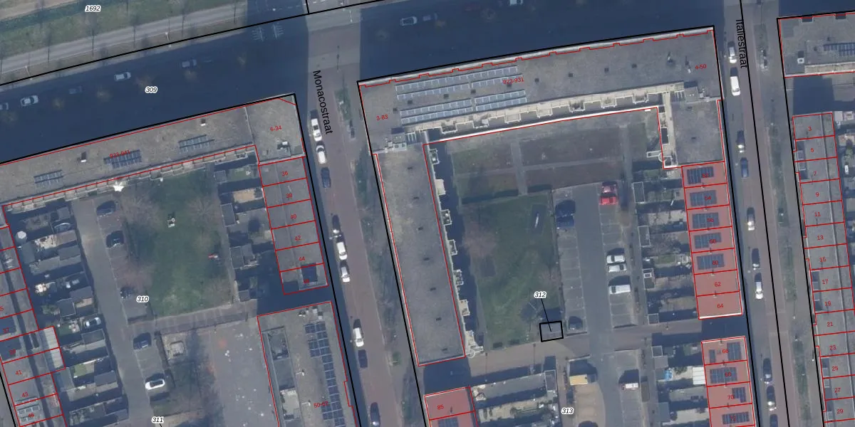 Het perceel waarop Monacostraat 11 staat heeft een oppervlakte van 1,2 ha. Dit is een zeer groot perceel. De perceeloppervlakte wordt geregistreerd door het Kadaster. Gedetailleerde informatie over de maten van dit perceel kunt u vinden in het rapport Kadastrale kaart met maatvoering van Monacostraat 11.