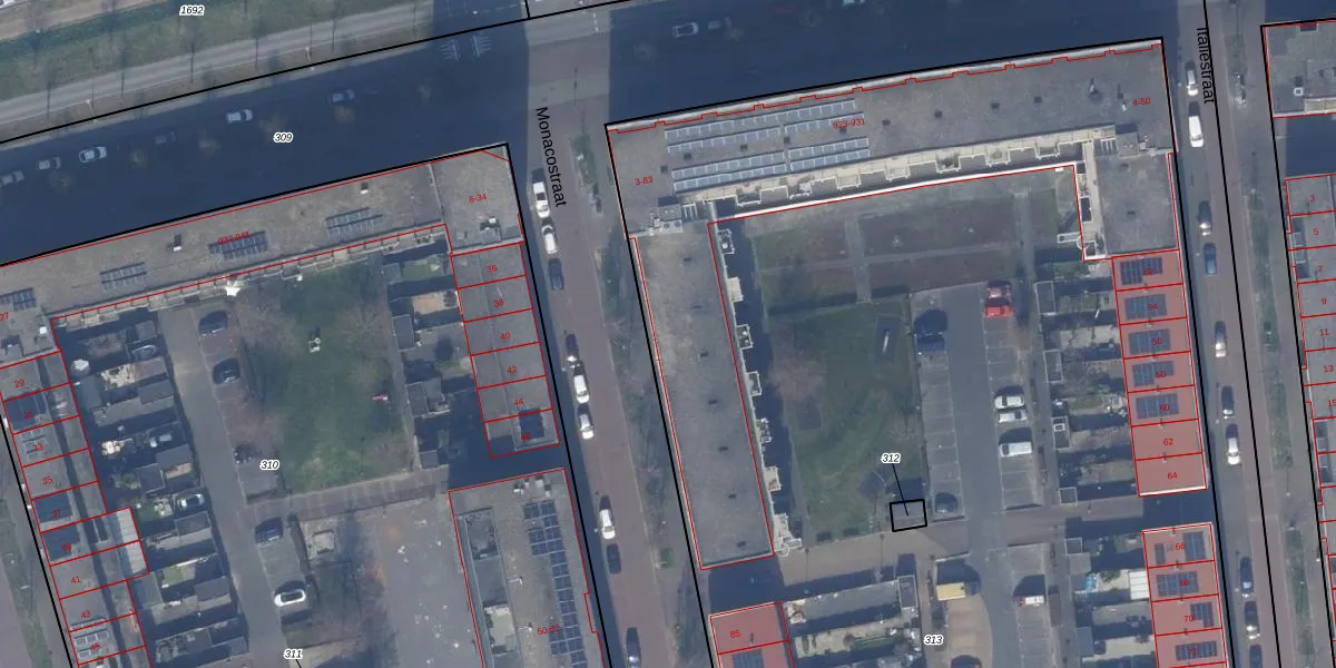 Het perceel waarop Monacostraat 75 staat heeft een oppervlakte van 1,2 ha. Dit is een zeer groot perceel. De perceeloppervlakte wordt geregistreerd door het Kadaster. Gedetailleerde informatie over de maten van dit perceel kunt u vinden in het rapport Kadastrale kaart met maatvoering van Monacostraat 75.