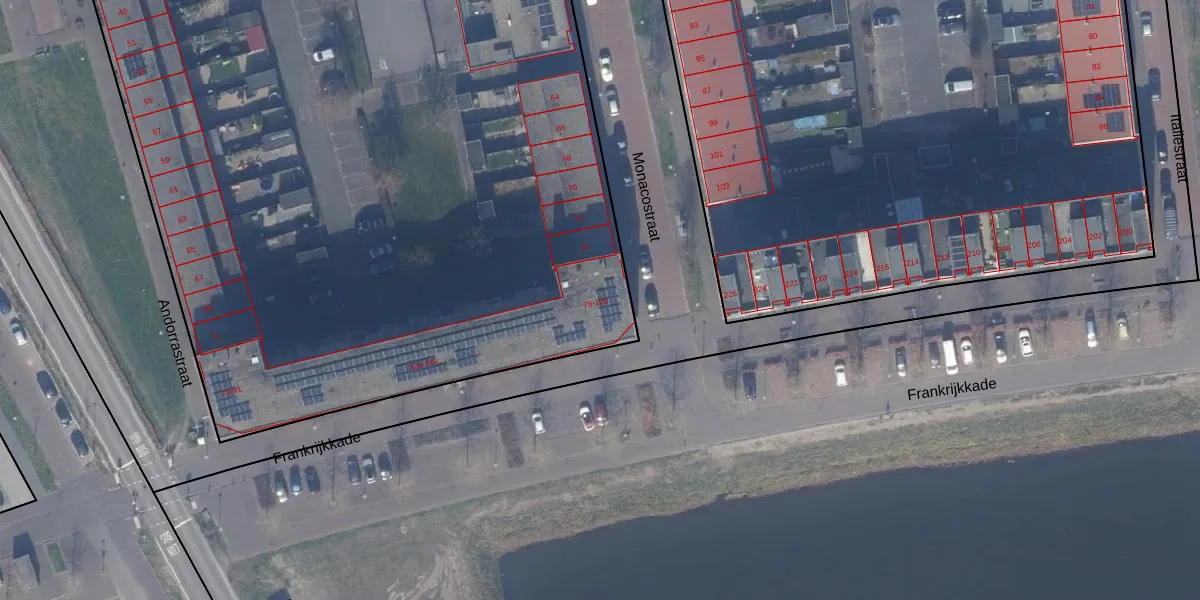 Het perceel waarop Monacostraat 94 staat heeft een oppervlakte van 1,2 ha. Dit is een zeer groot perceel. De perceeloppervlakte wordt geregistreerd door het Kadaster. Gedetailleerde informatie over de maten van dit perceel kunt u vinden in het rapport Kadastrale kaart met maatvoering van Monacostraat 94.