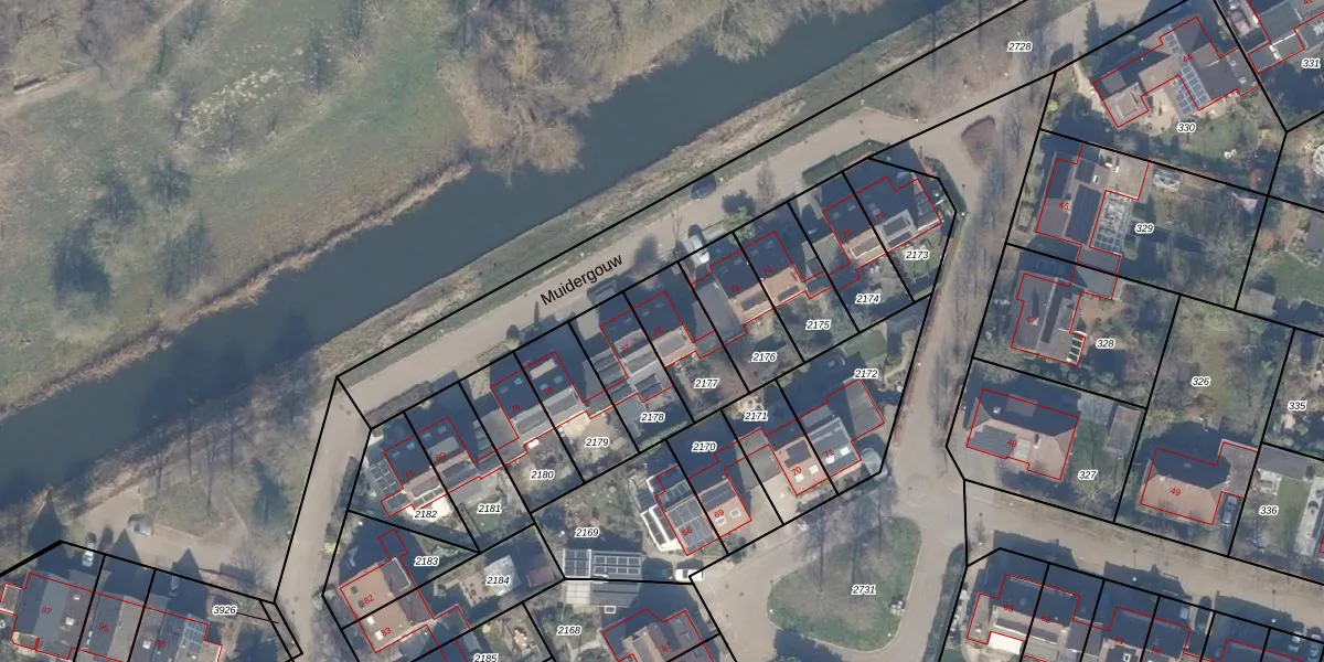Het perceel waarop Muidergouw 76 staat heeft een oppervlakte van 214 m². Dit is een middelgroot perceel. De perceeloppervlakte wordt geregistreerd door het Kadaster. Gedetailleerde informatie over de maten van dit perceel kunt u vinden in het rapport Kadastrale kaart met maatvoering van Muidergouw 76.