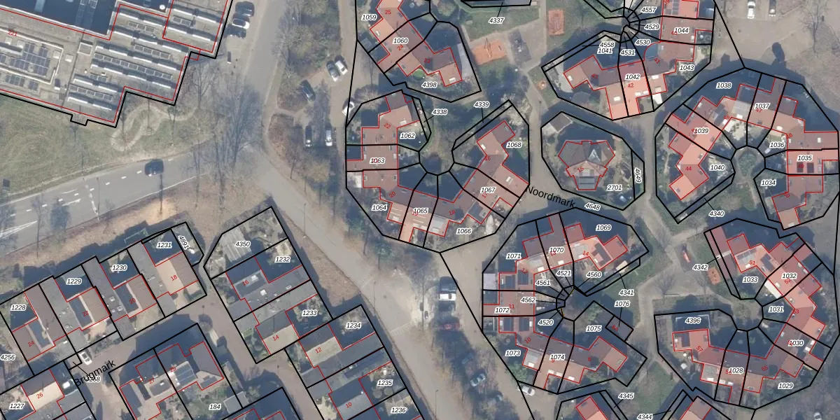 Het perceel waarop Noordmark 19 staat heeft een oppervlakte van 95 m². Dit is een klein perceel. De perceeloppervlakte wordt geregistreerd door het Kadaster. Gedetailleerde informatie over de maten van dit perceel kunt u vinden in het rapport Kadastrale kaart met maatvoering van Noordmark 19.
