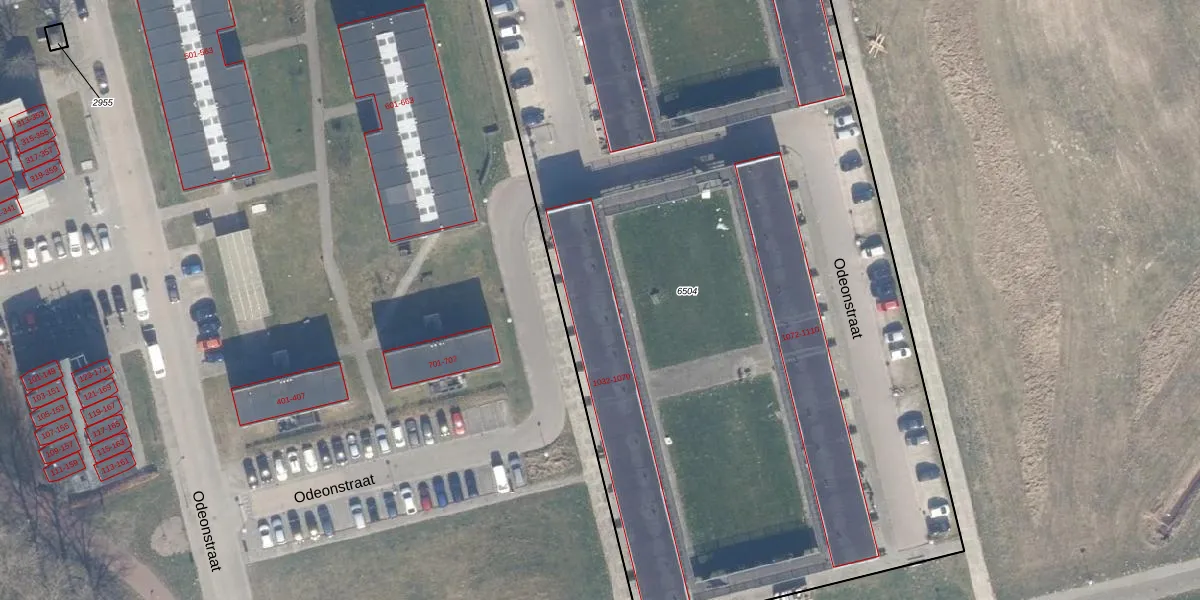 Het perceel waarop Odeonstraat 1036 staat heeft een oppervlakte van 8430 m². Dit is een zeer groot perceel. De perceeloppervlakte wordt geregistreerd door het Kadaster. Gedetailleerde informatie over de maten van dit perceel kunt u vinden in het rapport Kadastrale kaart met maatvoering van Odeonstraat 1036.