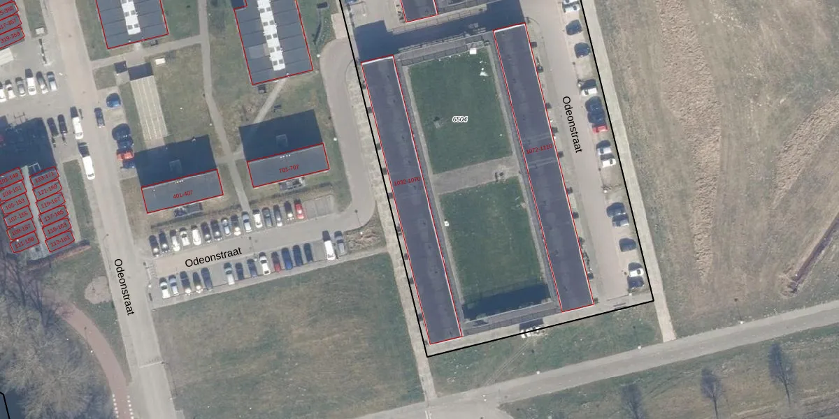 Het perceel waarop Odeonstraat 1042 staat heeft een oppervlakte van 8430 m². Dit is een zeer groot perceel. De perceeloppervlakte wordt geregistreerd door het Kadaster. Gedetailleerde informatie over de maten van dit perceel kunt u vinden in het rapport Kadastrale kaart met maatvoering van Odeonstraat 1042.