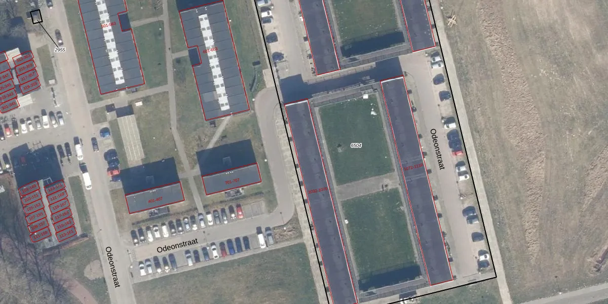 Het perceel waarop Odeonstraat 1056 staat heeft een oppervlakte van 8430 m². Dit is een zeer groot perceel. De perceeloppervlakte wordt geregistreerd door het Kadaster. Gedetailleerde informatie over de maten van dit perceel kunt u vinden in het rapport Kadastrale kaart met maatvoering van Odeonstraat 1056.