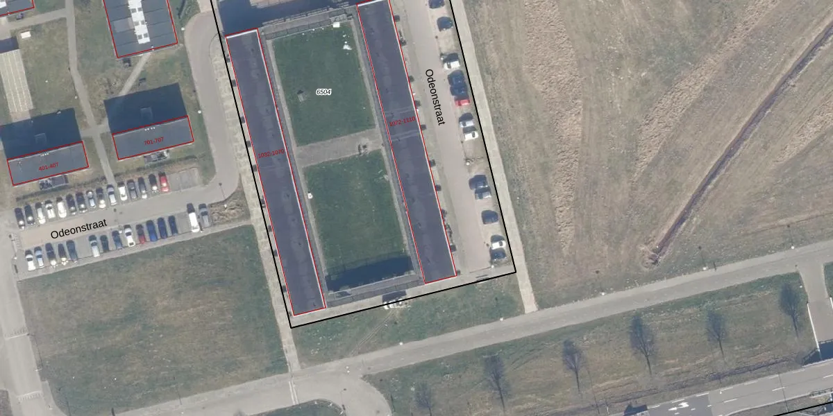Het perceel waarop Odeonstraat 1086 staat heeft een oppervlakte van 8430 m². Dit is een zeer groot perceel. De perceeloppervlakte wordt geregistreerd door het Kadaster. Gedetailleerde informatie over de maten van dit perceel kunt u vinden in het rapport Kadastrale kaart met maatvoering van Odeonstraat 1086.