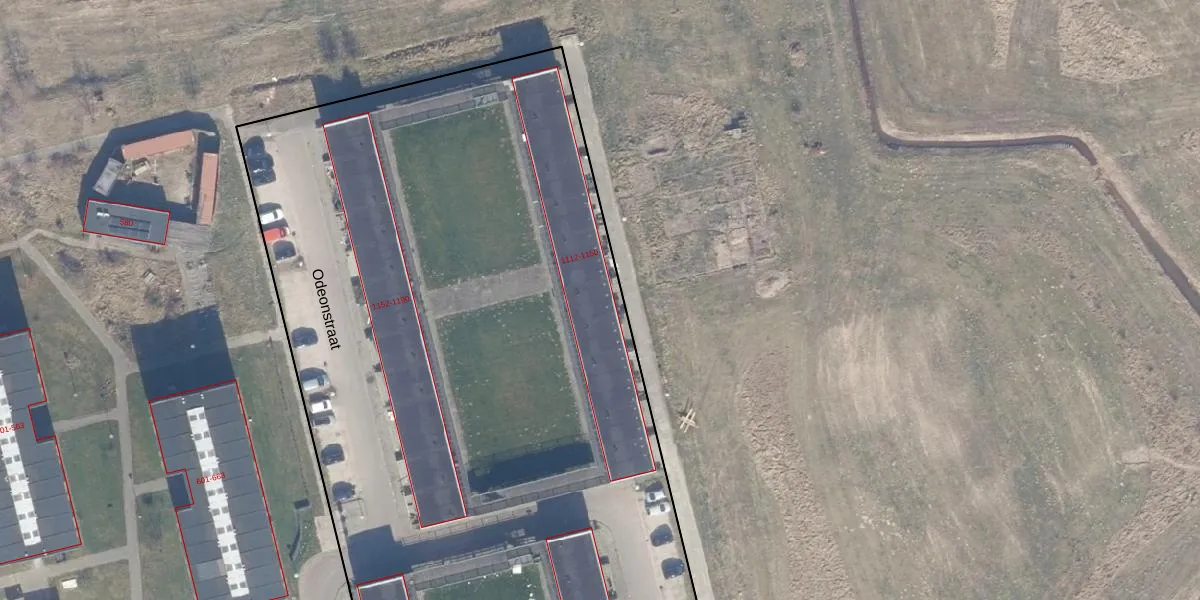 Het perceel waarop Odeonstraat 1140 staat heeft een oppervlakte van 8430 m². Dit is een zeer groot perceel. De perceeloppervlakte wordt geregistreerd door het Kadaster. Gedetailleerde informatie over de maten van dit perceel kunt u vinden in het rapport Kadastrale kaart met maatvoering van Odeonstraat 1140.