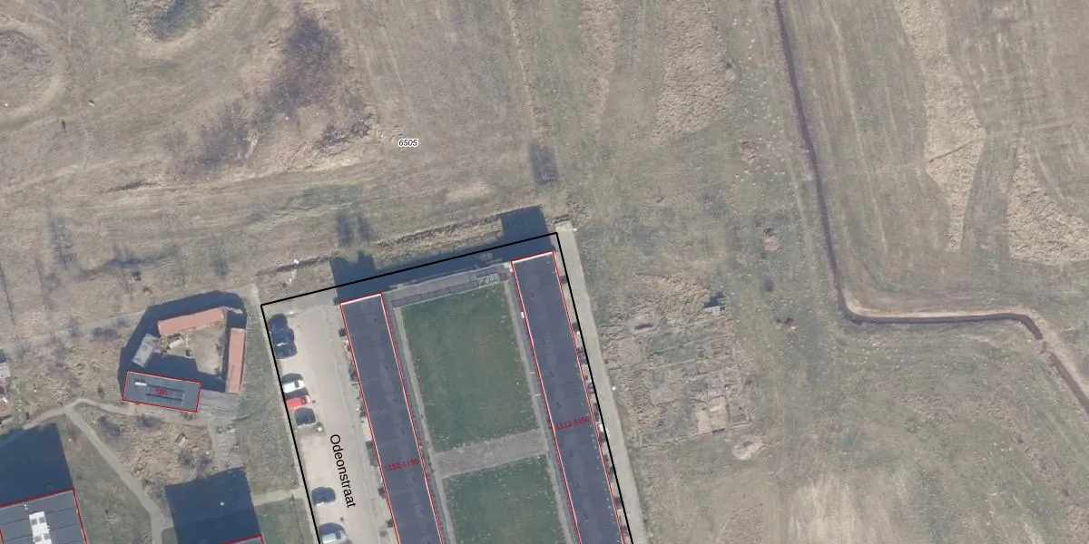 Het perceel waarop Odeonstraat 1150 staat heeft een oppervlakte van 8430 m². Dit is een zeer groot perceel. De perceeloppervlakte wordt geregistreerd door het Kadaster. Gedetailleerde informatie over de maten van dit perceel kunt u vinden in het rapport Kadastrale kaart met maatvoering van Odeonstraat 1150.