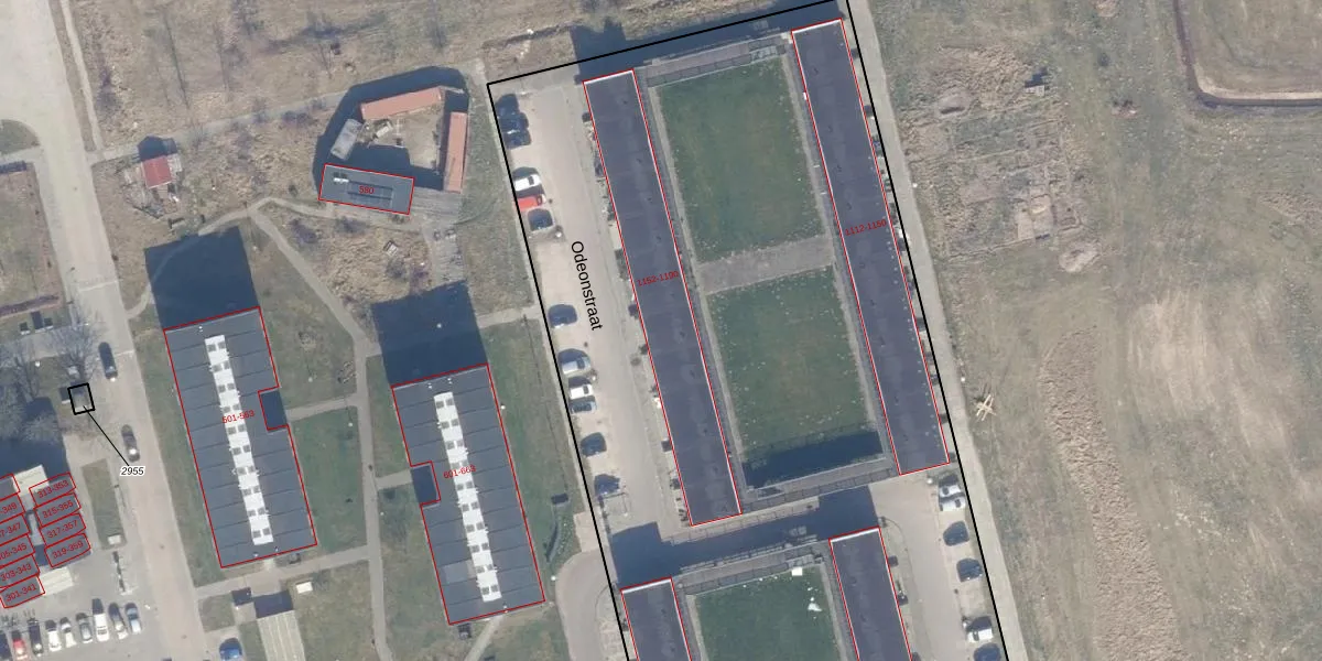 Het perceel waarop Odeonstraat 1180 staat heeft een oppervlakte van 8430 m². Dit is een zeer groot perceel. De perceeloppervlakte wordt geregistreerd door het Kadaster. Gedetailleerde informatie over de maten van dit perceel kunt u vinden in het rapport Kadastrale kaart met maatvoering van Odeonstraat 1180.