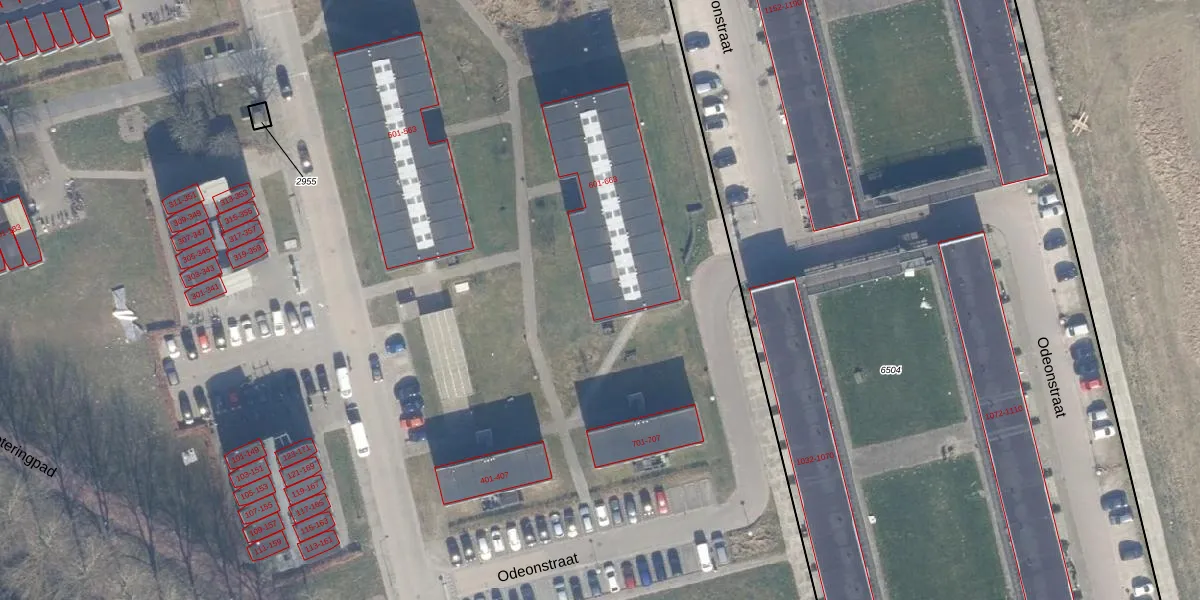 Odeonstraat 615 is gelegen op kadastraal perceel AMR04U6505. Deze kadastrale aanduiding is uniek en wordt gebruikt door het Kadaster om eigendomsrechten en andere zakelijke rechten vast te leggen. Het perceel maakt onderdeel uit van de kadastrale gemeente Almere.