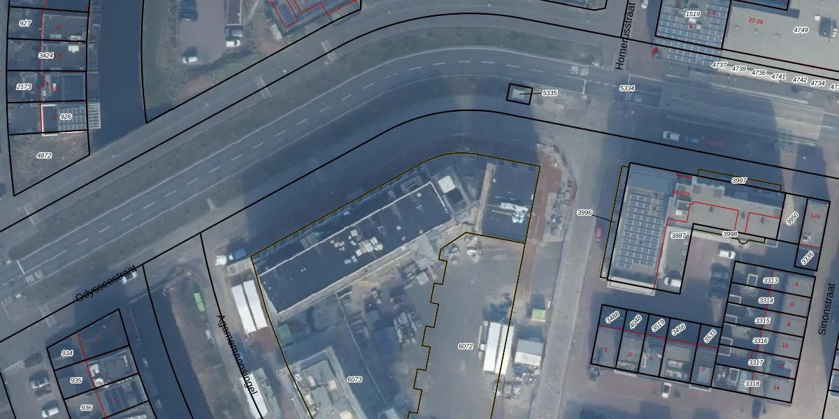 Het perceel waarop Odysseestraat 3-E staat heeft een oppervlakte van 3255 m². Dit is een zeer groot perceel. De perceeloppervlakte wordt geregistreerd door het Kadaster. Gedetailleerde informatie over de maten van dit perceel kunt u vinden in het rapport Kadastrale kaart met maatvoering van Odysseestraat 3-E.