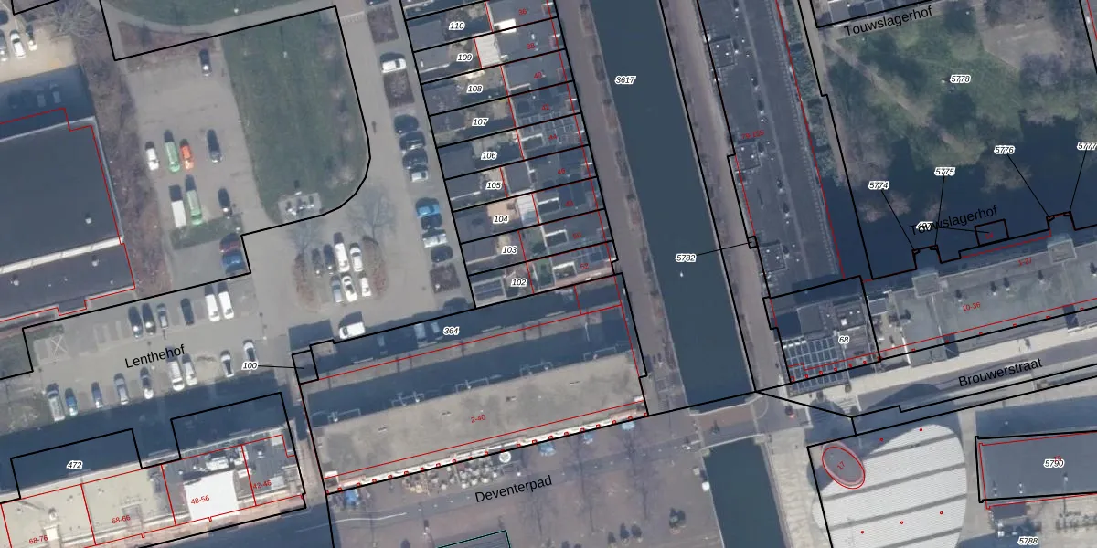 Het adres is gelegen op perceel 102 in de sectie K en de kadastrale gemeente Almere. De kadastrale aanduiding is aldus AMR04-K-102. Het perceel is kleiner dan gemiddeld in Almere. Het perceel is 165 m² groot, terwijl het gemiddelde ligt op 3328,15 m². Het grootste perceel in de kadastrale gemeente is 32,12 km². Het kleinste perceel heeft een oppervlakte van 0 m². Op het perceel zijn 2 adressen aanwezig. In de Basisregistratie Kadaster (BRK) werden de grenzen van het perceel geregistreerd op 18-05-1998.