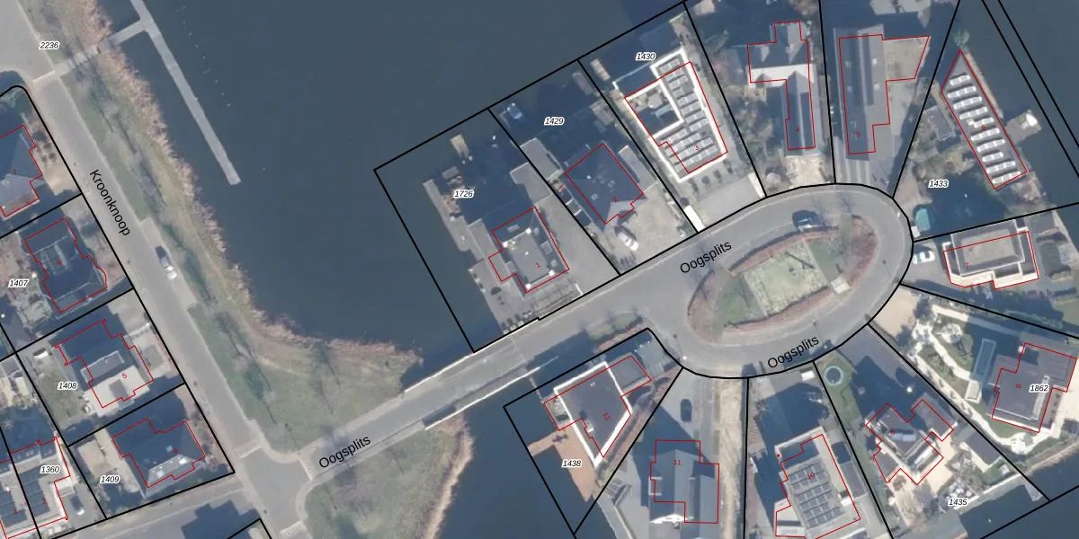 Het perceel waarop Oogsplits 1 staat heeft een oppervlakte van 1060 m². Dit is een zeer groot perceel. De perceeloppervlakte wordt geregistreerd door het Kadaster. Gedetailleerde informatie over de maten van dit perceel kunt u vinden in het rapport Kadastrale kaart met maatvoering van Oogsplits 1.