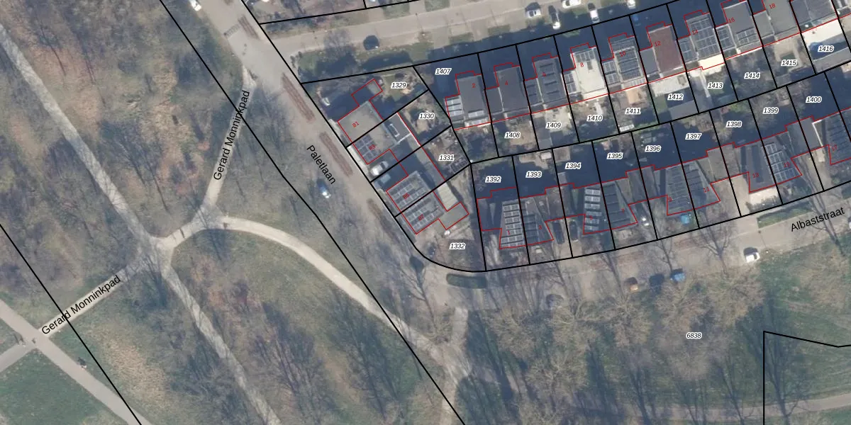 Het perceel waarop Paletlaan 87 staat heeft een oppervlakte van 319 m². Dit is een groot perceel. De perceeloppervlakte wordt geregistreerd door het Kadaster. Gedetailleerde informatie over de maten van dit perceel kunt u vinden in het rapport Kadastrale kaart met maatvoering van Paletlaan 87.