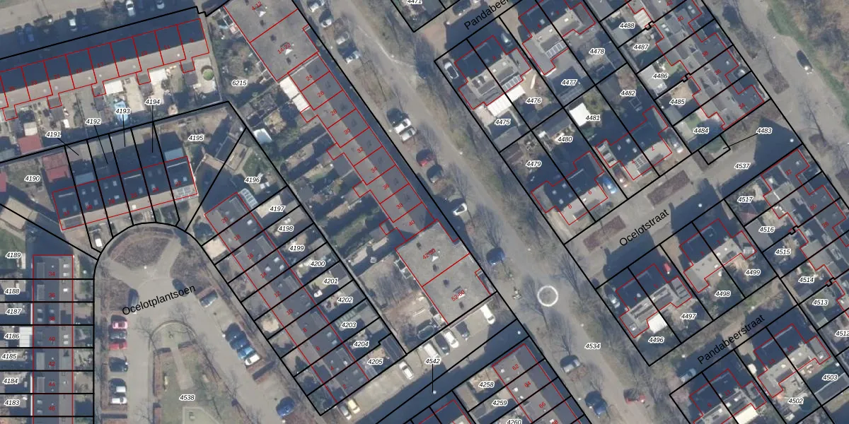 Het perceel waarop Pandabeerstraat 40 staat heeft een oppervlakte van 4589 m². Dit is een zeer groot perceel. De perceeloppervlakte wordt geregistreerd door het Kadaster. Gedetailleerde informatie over de maten van dit perceel kunt u vinden in het rapport Kadastrale kaart met maatvoering van Pandabeerstraat 40.