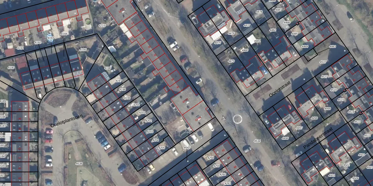 Het perceel waarop Pandabeerstraat 42 staat heeft een oppervlakte van 4589 m². Dit is een zeer groot perceel. De perceeloppervlakte wordt geregistreerd door het Kadaster. Gedetailleerde informatie over de maten van dit perceel kunt u vinden in het rapport Kadastrale kaart met maatvoering van Pandabeerstraat 42.