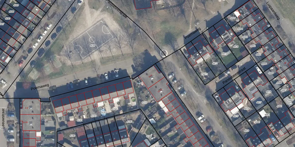 Het perceel waarop Pandabeerstraat 6 staat heeft een oppervlakte van 4589 m². Dit is een zeer groot perceel. De perceeloppervlakte wordt geregistreerd door het Kadaster. Gedetailleerde informatie over de maten van dit perceel kunt u vinden in het rapport Kadastrale kaart met maatvoering van Pandabeerstraat 6.
