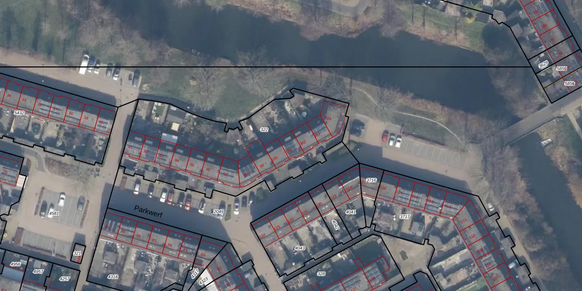 Het perceel waarop Parkwerf 101 staat heeft een oppervlakte van 1877 m². Dit is een zeer groot perceel. De perceeloppervlakte wordt geregistreerd door het Kadaster. Gedetailleerde informatie over de maten van dit perceel kunt u vinden in het rapport Kadastrale kaart met maatvoering van Parkwerf 101.