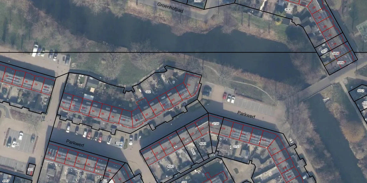 Het perceel waarop Parkwerf 103 staat heeft een oppervlakte van 1877 m². Dit is een zeer groot perceel. De perceeloppervlakte wordt geregistreerd door het Kadaster. Gedetailleerde informatie over de maten van dit perceel kunt u vinden in het rapport Kadastrale kaart met maatvoering van Parkwerf 103.