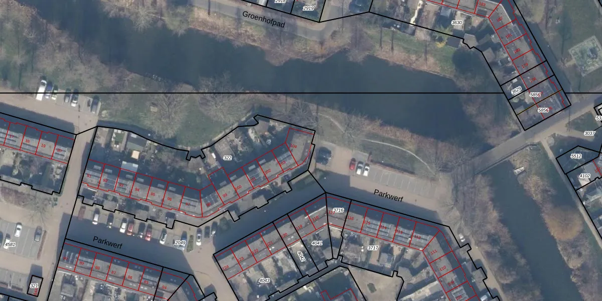 Het perceel waarop Parkwerf 104 staat heeft een oppervlakte van 1877 m². Dit is een zeer groot perceel. De perceeloppervlakte wordt geregistreerd door het Kadaster. Gedetailleerde informatie over de maten van dit perceel kunt u vinden in het rapport Kadastrale kaart met maatvoering van Parkwerf 104.