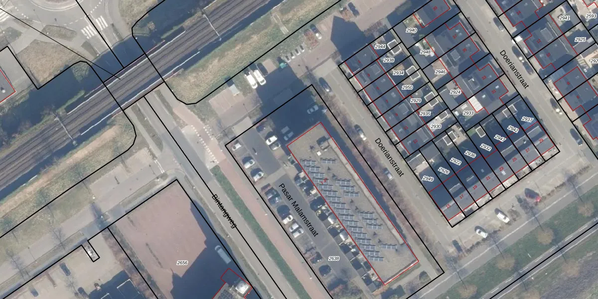 Het perceel waarop Pasar Malamstraat 37 staat heeft een oppervlakte van 2680 m². Dit is een zeer groot perceel. De perceeloppervlakte wordt geregistreerd door het Kadaster. Gedetailleerde informatie over de maten van dit perceel kunt u vinden in het rapport Kadastrale kaart met maatvoering van Pasar Malamstraat 37.