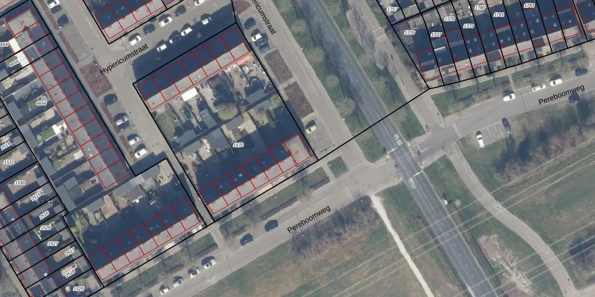Het perceel waarop Pereboomweg 47 staat heeft een oppervlakte van 2188 m². Dit is een zeer groot perceel. De perceeloppervlakte wordt geregistreerd door het Kadaster. Gedetailleerde informatie over de maten van dit perceel kunt u vinden in het rapport Kadastrale kaart met maatvoering van Pereboomweg 47.