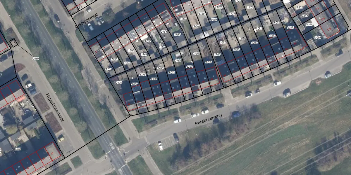 Het perceel waarop Pereboomweg 59 staat heeft een oppervlakte van 155 m². Dit is een middelgroot perceel. De perceeloppervlakte wordt geregistreerd door het Kadaster. Gedetailleerde informatie over de maten van dit perceel kunt u vinden in het rapport Kadastrale kaart met maatvoering van Pereboomweg 59.