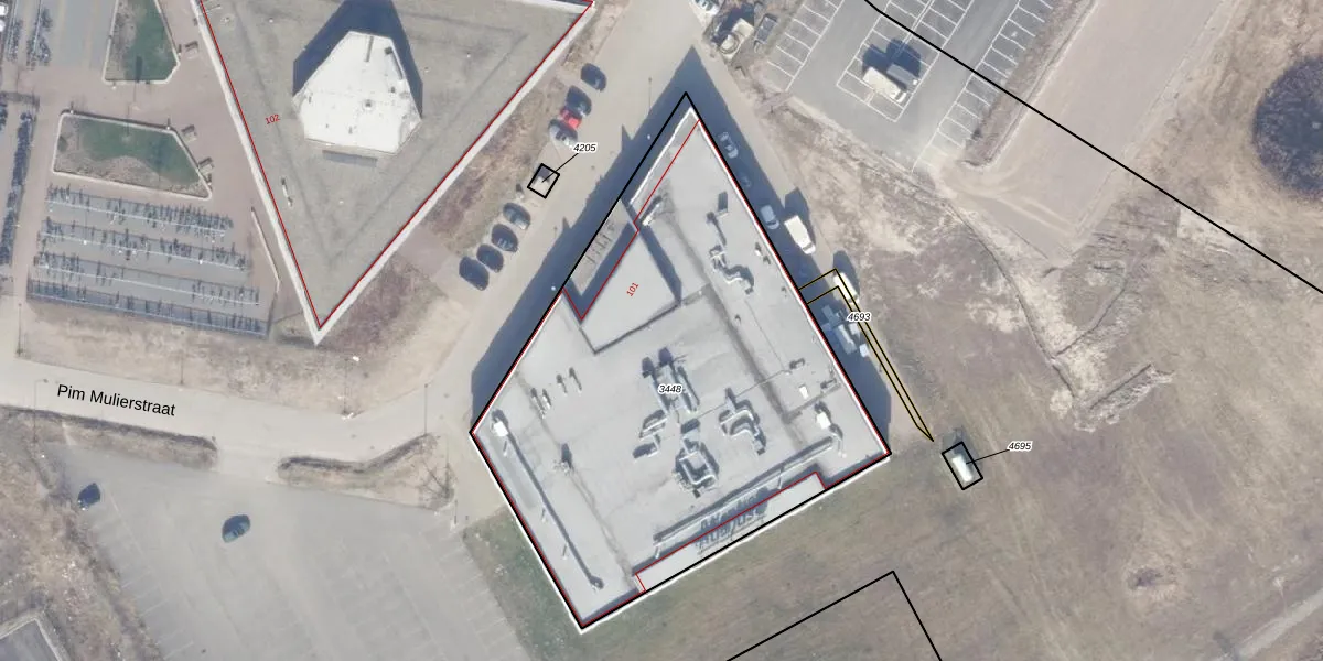 Pim Mulierstraat 101 is gelegen op kadastraal perceel AMR04W3448. Deze kadastrale aanduiding is uniek en wordt gebruikt door het Kadaster om eigendomsrechten en andere zakelijke rechten vast te leggen. Het perceel maakt onderdeel uit van de kadastrale gemeente Almere.