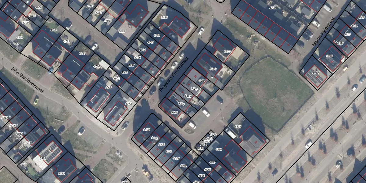 Het perceel waarop Polykarp Kuschstraat 6 staat heeft een oppervlakte van 103 m². Dit is een middelgroot perceel. De perceeloppervlakte wordt geregistreerd door het Kadaster. Gedetailleerde informatie over de maten van dit perceel kunt u vinden in het rapport Kadastrale kaart met maatvoering van Polykarp Kuschstraat 6.