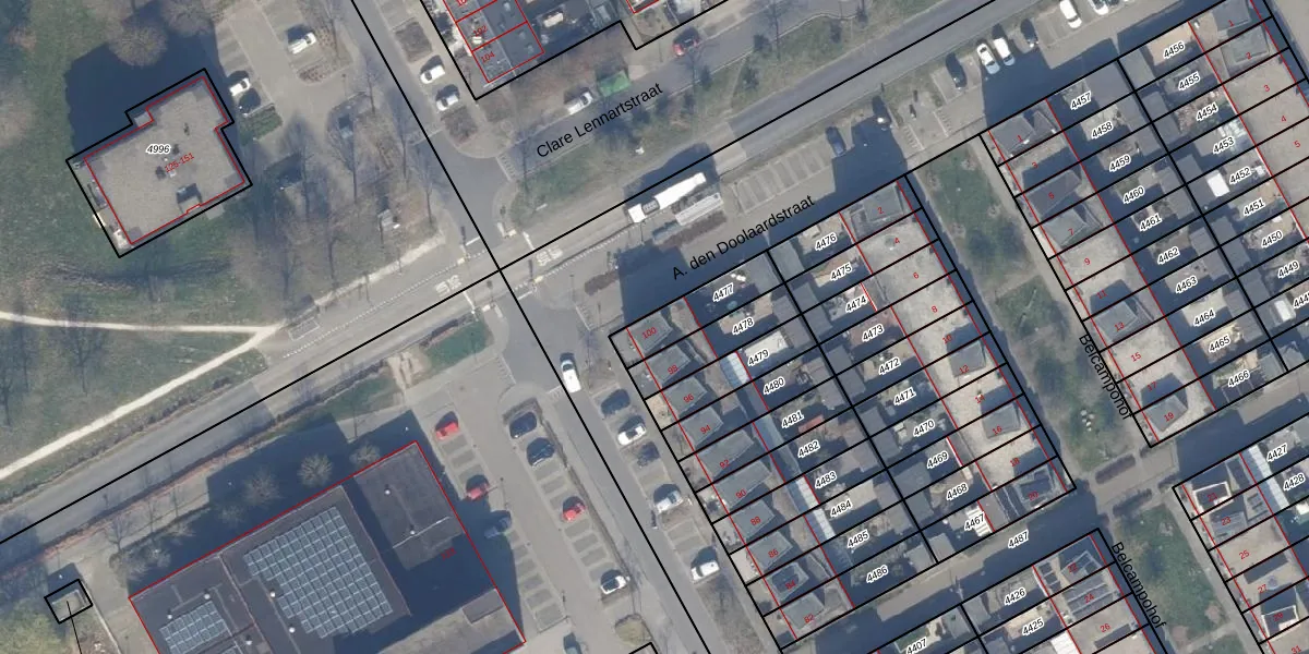 Het adres is gelegen op perceel 4477 in de sectie Q en de kadastrale gemeente Almere. De kadastrale aanduiding is aldus AMR04-Q-4477. Het perceel is kleiner dan gemiddeld in Almere. Het perceel is 157 m² groot, terwijl het gemiddelde ligt op 3327,75 m². De grootste perceeloppervlakte in de kadastrale gemeente is 32,12 km². De kleinste oppervlakte bedraagt 0 m². Dit is het enige adres dat aanwezig is op het perceel. De huidige grenzen van het perceel zijn digitaal in de Basisregistratie Kadaster (BRK) geregistreerd op 27-07-2006.