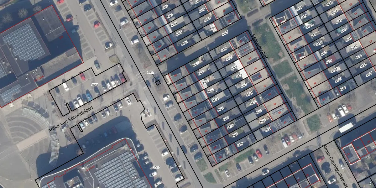Het adres is gelegen op perceel 4409 in de sectie Q en de kadastrale gemeente Almere. De kadastrale aanduiding is aldus AMR04-Q-4409. Het perceel is kleiner dan gemiddeld in Almere. Het perceel is 148 m² groot, terwijl het gemiddelde ligt op 3327,75 m². De grootste perceeloppervlakte in de kadastrale gemeente is 32,12 km². De kleinste oppervlakte bedraagt 0 m². Er zijn geen andere adressen aanwezig op het perceel. De huidige grenzen van het perceel zijn digitaal in de Basisregistratie Kadaster (BRK) geregistreerd op 27-07-2006.