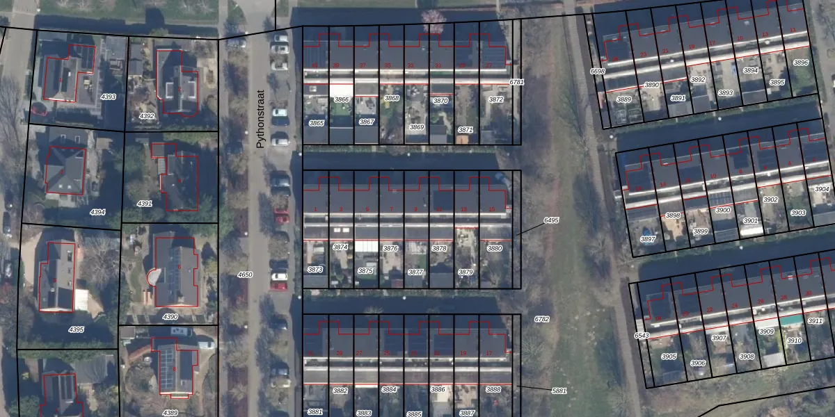 Pythonstraat 9 is gelegen op kadastraal perceel AMR04N3877. Deze kadastrale aanduiding is uniek en wordt gebruikt door het Kadaster om eigendomsrechten en andere zakelijke rechten vast te leggen. Het perceel maakt onderdeel uit van de kadastrale gemeente Almere.