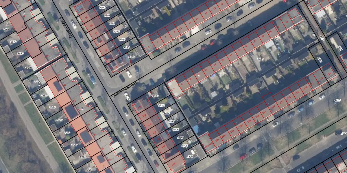 Het perceel waarop Quadrillestraat 2 staat heeft een oppervlakte van 4327 m². Dit is een zeer groot perceel. De perceeloppervlakte wordt geregistreerd door het Kadaster. Gedetailleerde informatie over de maten van dit perceel kunt u vinden in het rapport Kadastrale kaart met maatvoering van Quadrillestraat 2.