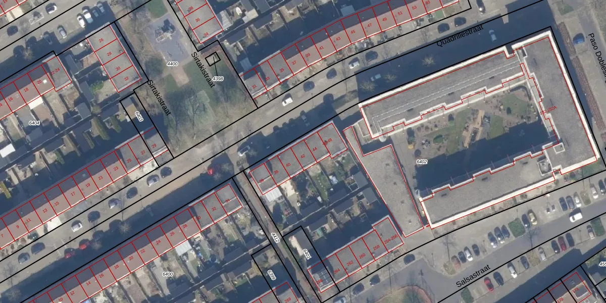 Het perceel waarop Quadrillestraat 42 staat heeft een oppervlakte van 5333 m². Dit is een zeer groot perceel. De perceeloppervlakte wordt geregistreerd door het Kadaster. Gedetailleerde informatie over de maten van dit perceel kunt u vinden in het rapport Kadastrale kaart met maatvoering van Quadrillestraat 42.