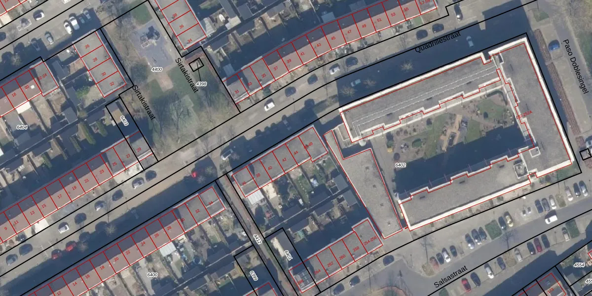 Het perceel waarop Quadrillestraat 44 staat heeft een oppervlakte van 5333 m². Dit is een zeer groot perceel. De perceeloppervlakte wordt geregistreerd door het Kadaster. Gedetailleerde informatie over de maten van dit perceel kunt u vinden in het rapport Kadastrale kaart met maatvoering van Quadrillestraat 44.