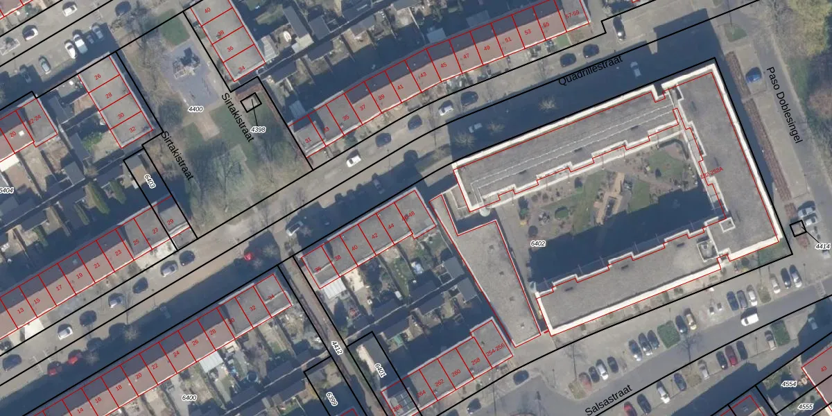 Het perceel waarop Quadrillestraat 46 staat heeft een oppervlakte van 5333 m². Dit is een zeer groot perceel. De perceeloppervlakte wordt geregistreerd door het Kadaster. Gedetailleerde informatie over de maten van dit perceel kunt u vinden in het rapport Kadastrale kaart met maatvoering van Quadrillestraat 46.