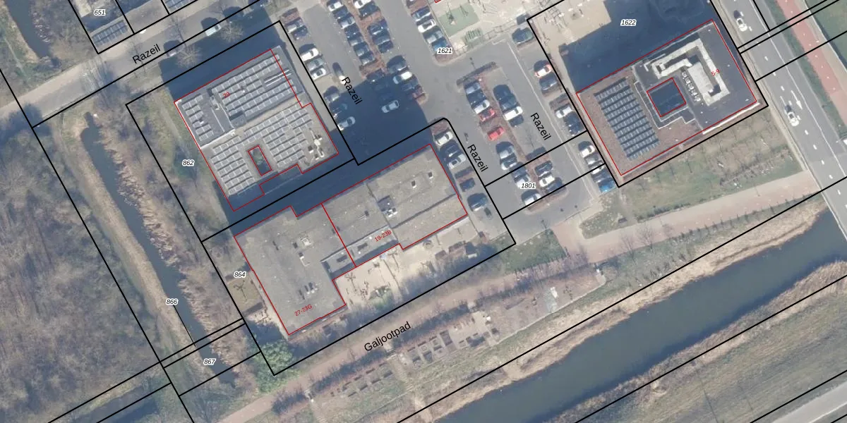 Het perceel waarop Razeil 25 staat heeft een oppervlakte van 2290 m². Dit is een zeer groot perceel. De perceeloppervlakte wordt geregistreerd door het Kadaster. Gedetailleerde informatie over de maten van dit perceel kunt u vinden in het rapport Kadastrale kaart met maatvoering van Razeil 25.